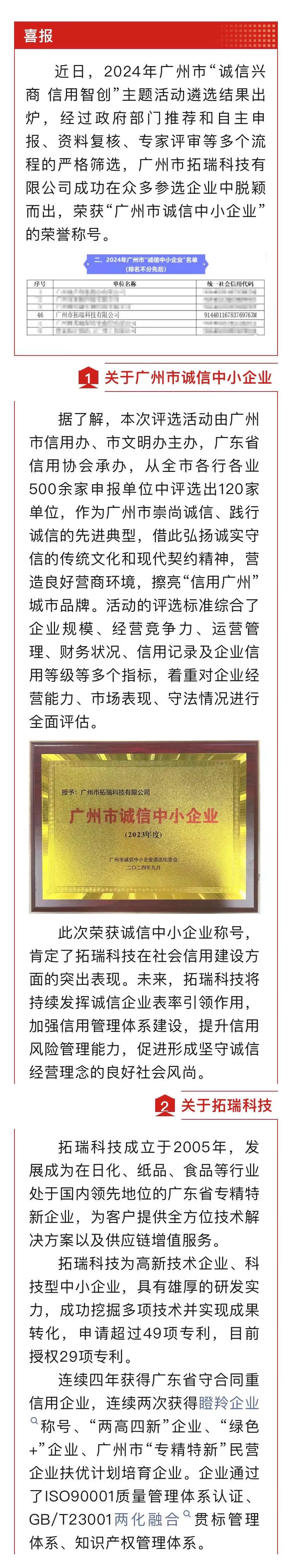 【喜訊】拓瑞科技榮獲“廣州市誠(chéng)信中小企業(yè)”稱號(hào)